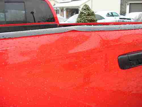 Some minor flaws are as described.a dent up high on the tailgate ..Some tiny barely noticable dents down low on the drivers side in front of the back tire in the silver painted area.There is a small dent behind drivers side rear door on the cab corner probably not noticable in the pictures.