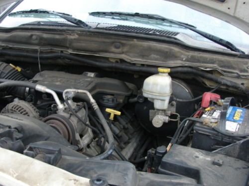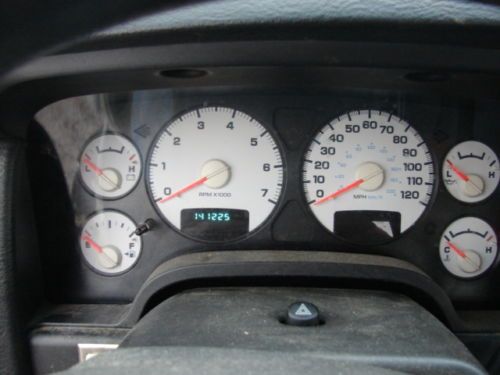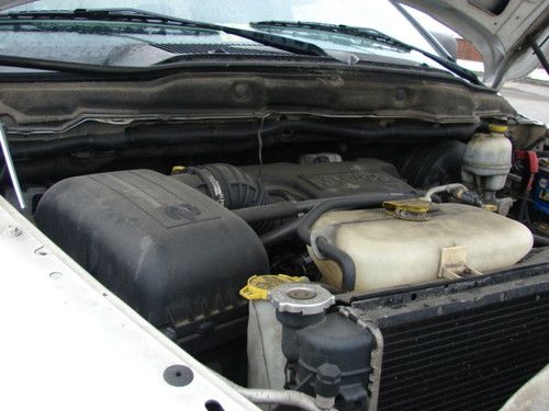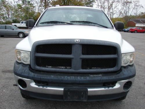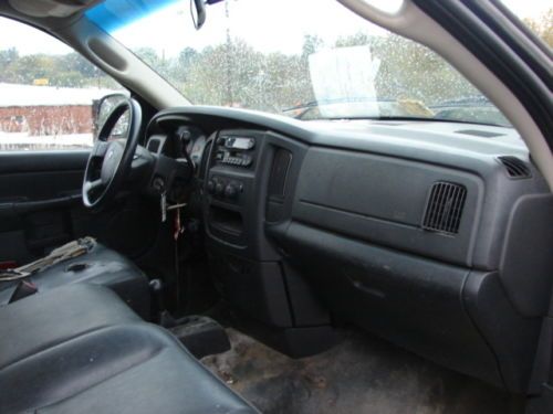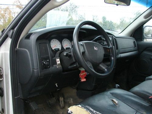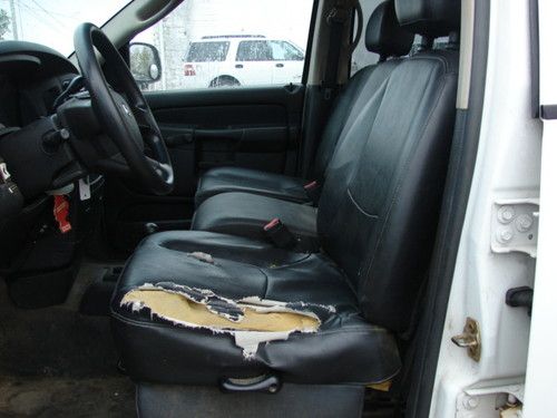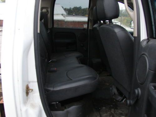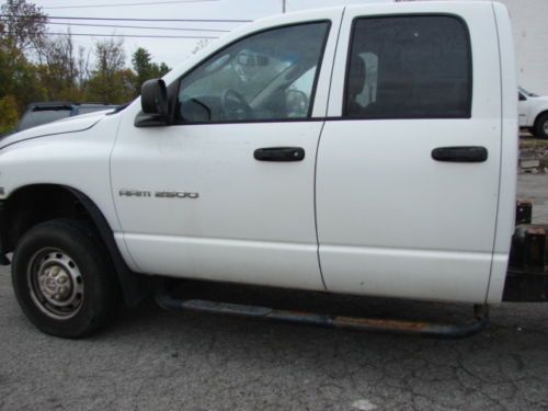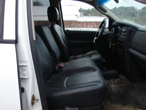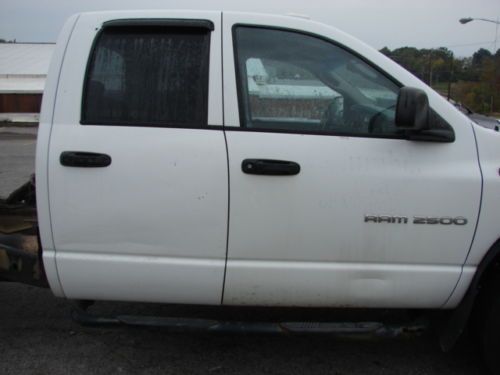 EXCELLENT VALUE JUST OFF FLEET LEASE FROM A NATURAL GAS COMPANY A 2004 DODGE RAM 2500HD 8 FT FRAME CHASSIS 4X4 CREW CAB TRUCK. THIS TRUCK HAS A STRONG RUNNING 5.7 HEMI V8 GAS ENGINE AND A SMOOTH SHIFTING 5 SPEED AUTOMATIC TRANSMISSION. THE REAR AXLE IS 3:73 AXLE RATIO WITH THE LIMITED SLIP OPTION ADDED. THE ODOMETER STATEMENT FROM THE LEASE COMPANY READS 180517. THE ODOMETER READS 141225. THE INTERIOR HAS BLACK VINYL SEATS AND RUBBER FLOOR MATS. THE SEATS HAVE WEAR TEARS MAINLY ON THE DRIVERS SEAT. THE EXTERIOR HAS A COUPLE OF CREASE LINES ON THE PASSENGER SIDE DOORS AND THE REAR PASSENGER DOOR HAS A SMALL AREA OF CLEAR COAT LOSS NEAR THE BOTTOM. OTHERWISE NORMAL DINGS DENTS SCRATCHES CHIPS AND SO FORTH FOUND ON A |