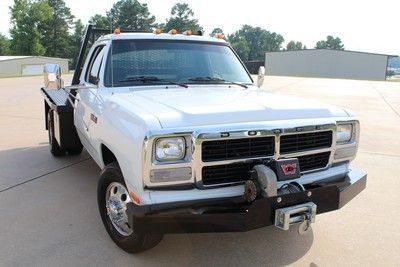 This is a 1993 Dodge D350 with the 12 valve cummins diesel engine. It has the 5 speed getrag standard transmission. The truck has 75,000 original miles. The truck has brand new paint done by a professional body shop in my hometown. The bed has black automotive paint on the sides and the headache rack then it has line-x bedliner on the top. I had a professional do the bedliner as well. I installed 2 new buyers toolboxes under the bed. On the front it has a stand up warn winch that has been redone with 125' of new 3/8" cable. The front bumper is made for that winch. It has michelin tires on the front with approx. 40% tread remaining and on the rear it has goodyear wranglers with 90% tread left. The truck runs and drives as good or better than a brand new one. It has Ultra aluminum wheels on it. It has a new headliner. I installed a tach and I have a boost and pyrometer new in the box. LED lights all the way around. Glass is in perfect condition the windows are tinted but the work was done by a professional shop. All new brakes front and rear. The bed has a gooseneck ball and then a regular bumper pull receiver hitch. Engine does not use a drop of oil and the oil looks brand new when you drain after 5,000 miles. The dash is in perfect condition and it is the original dash. No cracks or anything. Radio works good. Air blows cold. Clutch is in great condition. THE ENGINE IS STOCK AND HAS NEVER BEEN TAMPERED WITH. NEVER BEEN TOUCHED. The only thing I did was have the muffler shop remove the muffler and replace it with straight pipe. Everything has been painted underneath and the bed was removed before any painting was done anywhere on it. If you have any other questions please call me or text me. (318) 245-nine one one zero or jake198haddox@aol.com buyer must pay for shipping
