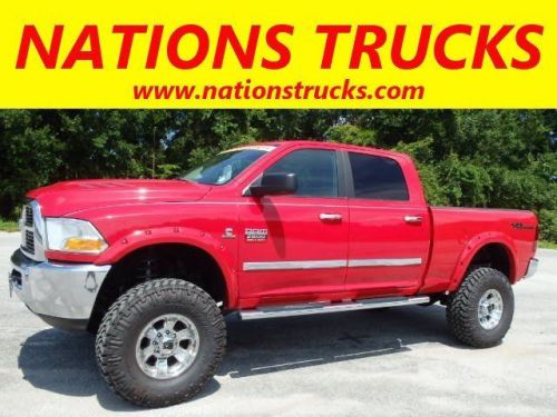 2012 Dodge Ram 2500 SLT Crew Cab Cummins Diesel 4x4 Monster, FLAWLESS ONE-OWNER, fully inspected, serviced and certified with balance of manufacturers warranty until 3/16/2017! This eye catching three quarter ton beauty is as nice as the day that it rolled off of the assembly line and she stands tall atop 6" of Rough Country lift, four brand new 37" Nitto Trail Grappler tires and 17" XD wheels! Fully equipped with bedliner, chrome nerf bars, towing package, power sliding rear window, keyless entry, power windows, power doorlocks and mirrors, cruise control, tilt steering wheel, AM/FM stereo with CD/MP3 player and Sirius satellite radio! You will not find another truck this nice anwhere else in the world, visit Nations Trucks today and let us help you find the perfect truck for both you and your budget! *Repair Description: 15 Mile Road Test, 135 Point Inspection, Lube Oil and Filter, Battery Test: Good, Full Detail, Total Invested = $455.00...Labor time quoted by All Data Universal Shop Key. DON'T SETTLE FOR LESS, WE CAN GET YOU FINANCED!**see dealer for details All certified Nations Trucks have been fully inspected and serviced and come backed by our ONE YEAR BUMPER TO BUMPER WARRANTY! We look forward to earning your business, please call 866-535-5519 to schedule your test drive or visit us anytime at www.NATIONSTRUCKS.com