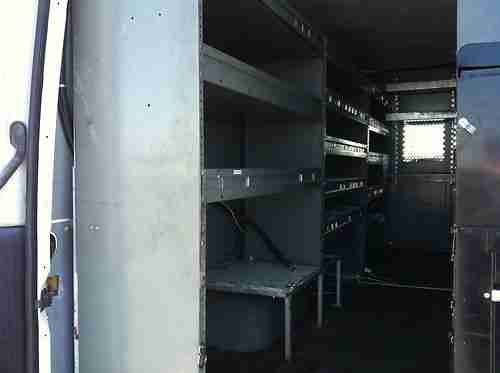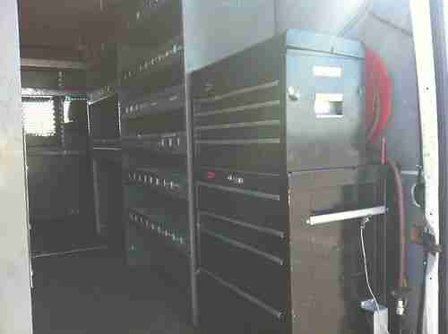 170" LONG WHEEL BASE5 METAL SHELF UNITS ON BOTH SIDES, TOOL BOX IN REAR, COMPRESSOR HOSE IN REAR, WORK TABLE IN FRONT - FULLY SET UP AT A COST OF OVER $3500