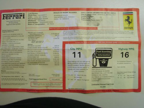 2005 Transmission: Automatic F1 Make: Ferrari Body Type: Coupe Model: 430 Vehicle Title: Clear Engine: 8 Fuel Type: Gas Mileage: 27,223 For Sale By: Private Owner Sub Model: Berlinetta Disability Equipped: No Exterior Color: Red Doors: 2 Interior Color: Black Drivetrain: Rear Wheel Drive Vehicle Original Optional equipment: Red brake calipers, Carbon ceramic brake system, Battery charger tender, Daytona style seats, Electrically operated seats, Scuderia Ferrari Shields, Upholstered Leather Top, Leather Rear Shelf/Door Moulding High Power/Hi Fi w/Subwoofer, All stitching in color, Tires Pressure Measurement and BBS Challenge Style Wheels. Optional Items amounted to $29,041, Retail price of vehicle was $209,826 as displayed in photos of sticker from vehicle. After-Market Items: Tubi Challenge Exhaust and Pioneer Radio/CD. |