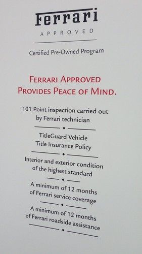 - Car is Factory Certified, so you are buying a car that still has Ferrari Factory Warranty almost thru 2015 - It's a completely worry free purchase!