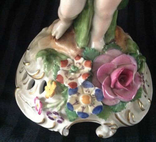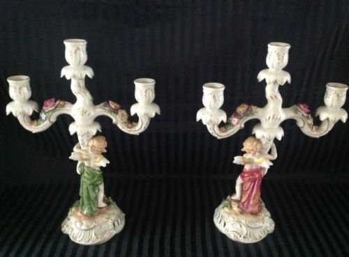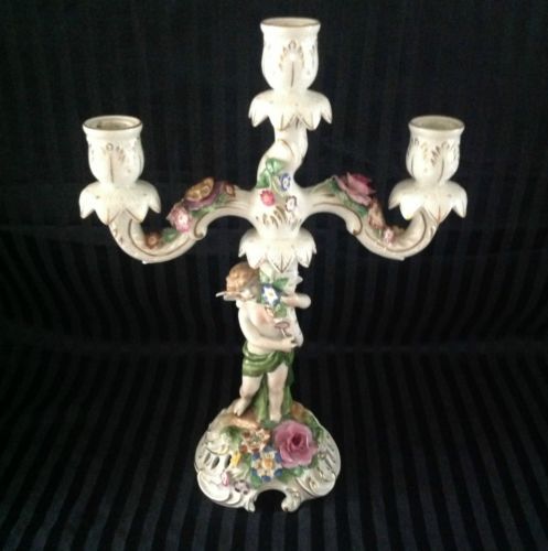 Pair of Antique Dresden Porcelain flowers and putti three candle holder candelabra .Those are in excellent condition. . They stand 14 " tall x 10 " across. Marked on the bottom. Dresden china is any china made in the town of Dresden, Germany. The most famous factory in Dresden is the Meissen factory. Figurines of eighteenth-century ladies and gentlemen, animal groups, or cherubs and other mythological subjects were popular. One special type of figurine made in Dresden was made with skirts of porcelain-dipped lace. The most famous Dresden figurines, the "crinoline groups," show court life scenes like people dancing and playing instruments. Do not make the mistake of thinking that all pieces marked Dresden are from the Meissen factory. The Meissen pieces usually have crossed swords marks, and are listed under Meissen. Some recent porcelain from Ireland, called Irish Dresden, is not included here.