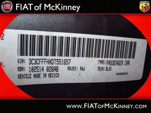 FIAT of McKinney is offering this clean and reliable 2013FIAT500AbarthPriced below NADA Retail!!! Rack up savings on this specially-priced Vehicle!!! WEB SPECIAL.. Gets Great Gas Mileage: 34 MPG Hwy** Less than 6k miles!!! You don't have to worry about depreciation on this trustworthy Abarth!!!!!! Extremely sharp!! Priced below NADA Retail!!! Rack up savings on this specially-priced Vehicle!!! This great FIAT is one of the most sought after vehicles on the market because it NEVER lets owners down. Great safety equipment to protect you on the road: ABS, Traction control, Curtain airbags, Passenger Airbag, Front fog/driving lights...Relax in the comfort of features like: wireless phone connectivity - BLUE&ME, Power locks, Power windows, Manual Transmission, Turbo.... Please contact our Pre-Owned Sales Department at 888-871-9401. Large selection of new and preowned vehicles. We have access to over 2000 pre-owned vehicles so if we do not have it, we can find it for you. We also deliver to most places in Texas and Oklahoma...call us for more details!