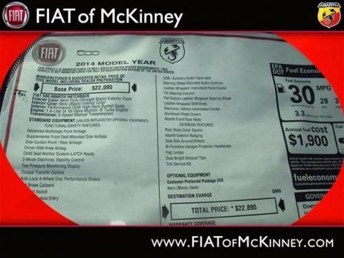 Classy! Priced below MSRP!!! Climb into savings with our special pricing on this trustworthy 2014 FIAT 500 Abarth. Special Financing Available: APR AS LOW AS 0% OR REBATES AS HIGH AS $1,500!!! Classy! SAVE AT THE PUMP!!! 34 MPG Hwy! It just doesn't get any better!! This Vehicle is simply quality in every aspect. One of the finest cars around, you won't believe what you get for the money* Great safety equipment to protect you on the road: ABS, Traction control, Curtain airbags, Passenger Airbag, Front fog/driving lights...A wealth of standard amenities means that you no longer have to sacrifice: wireless phone connectivity - BLUE&ME, Power locks, Power windows, Manual Transmission, Turbo...