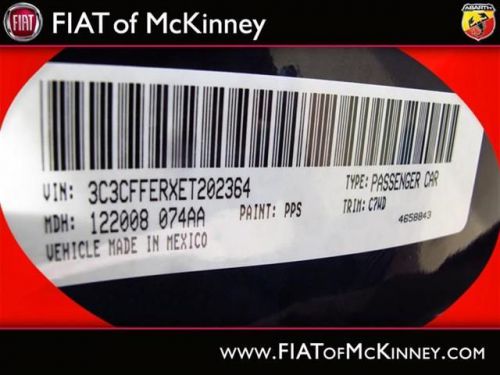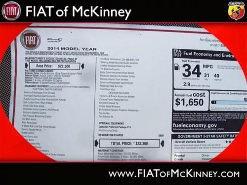 Ready for anything!! Ready for anything!! It just doesn't get any better!! This Lounge is simply great in every aspect. One of the finest cars around, you won't believe what you get for the money... This 2014 FIAT 500c Lounge won't last long at $733 below MSRP! Special Financing Available: APR AS LOW AS 0% OR REBATES AS HIGH AS $1,500.. Great safety equipment to protect you on the road: ABS, Traction control, Curtain airbags, Passenger Airbag, Front fog/driving lights...NICELY EQUIPPED: wireless phone connectivity - BLUE&ME, Power locks, Power windows, Convertible roof - Power, Climate control...