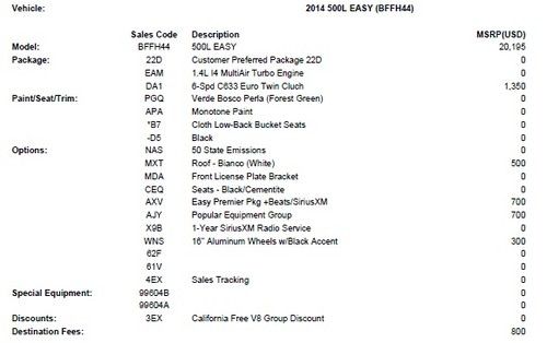The Italians aren't coming, the Italians are here! The new 2014 500L creates more room and space but uses the same engine in the Abarth. You may not be sliding around in your house like Charlie Sheen, but you will enjoy 25 MPG in the City and 33 MPG on the Highway. You get a lot of bang for the buck and that's not just on gas savings with this car taking ques from Alfa Romo. If you have a trade in, that’s OK. If you need financing, that’s OK. If you want an extended warranty for additional protection on your investment, that's Ok. If you need help getting it from us to you, that’s OK. If you need a ride from the airport to the dealership, that's OK. The customer is responsible for all taxes, tag, wheel and title fees; as well as shipping from us to you. There will be a $599 doc fee added on all sales with no exceptions. For questions please call Doug Grammer at (423) 580-8618 or email dgrammer@crowncars.com. |