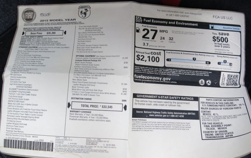2015 Fiat 500 Abarth Convertible (VIN: 3C3CFFJH2FT625616), Nero Puro (straight black) over Nero leather with red stitching and accents, 3,850 original, 1-owner miles, heavy duty 6-speed auto trans, 1.4L 16V turbocharged & twin-intercooled Inline-4 cyl., 7 airbags, hill-start assist, 3-levels of stability control, rear park assist, tire pressure monitoring, retractable cloth top operates up to 60 mph., Options: Abarth sport body kit, Abarth performance exhaust, Koni adjustable front suspension & brakes with red calipers, aluminum pedal covers, heavy duty 6-speed auto trans. premium leather int., Pref Package 2 incl. Beats premium audio with Sirius XM radio & Blue&Me hands-free phone & music, lots of USB, aux & power plugs, Comfort and Convenience Package incl. auto climate control, heated front seats, leather wrapped steering wheel & shift knob, black trimmed exterior lights, white Abarth mirror caps and body stripe, Abarth exterior badging, 17” white lightweight rims, books, manuals, window sticker & both keys / remotes, carpeted and rubber mats, just serviced 09/16/2020, no cosmetic flaws - as nice as a pre-owned car gets, has the best sounding factory exhaust outside of high end exotics, new MSRP of $33,545.00, full factory warranty until Jan. 12, 2021 or 50,000 miles, offered at $17,300.00 / best offer. Call or text Brian @ (812) 760-5513 ~ located in Southern IN 47711.
