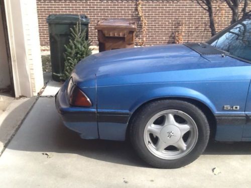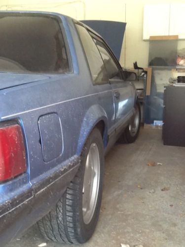 THANKS FOR VIEWING MY AUCTION! SELLING MY 1989 MUSTANG NOTCHBACK 5.0 5SP. NO OPTION CAR, SUPER LIGHT. ROLL UP WINDOWS, NON POWER LOCKS, NO REAR DEFROST. THE CAR HAS ZERO RUST WITH ORIGINAL BLUE PAINT (NOW FADED BLUE) ORIGINALLY FROM CALIFORNIA AND NOW IN THE MIDWEST.NOTE THE PAINT IS 25 YEARS OLD AND LOOKS LIKE IT. PICS FOR UNDERNELTH CAR IS AS CLEAN AS BODY. I WAS TOLD FROM PREVIOUS OWNER THE STANG SAT IN THE GARAGE FOR 10 YEARS AFTER COMPLETELY REDOING THE ENGINE, BRAND NEW TRANS AND REAREND GEAR. ONLY DRIVEN 500 MILES SINCE DONE. FORNATELY HE KEPT MOST OF THE RECEIPTS WHICH I HAVE NOW. THE ENGINE WAS PUNCHED OUT TO A 306 NOW. HEARS A LIST OF STUFF DONE TO THE CAR, IM SURE THERE IS MORE IM FORGETTING: * TRICK FLOW UPPER AND LOWER INTAKE.-TRICK FLOW TRISTED WEDGE HEADS.- TRICKFLOW STAGE 1 CAM,- CENTERFORCE CLUTCH,- MAGNAFLOW HIGH FLOW CATS AND CATBACK EXHAUST,- FORD RACING ROLLER CHAIN,- EAGLE I-BEAM CONNECTING RODS,- HIGH PERFORMANCE TRICK FLOW EGR SPACER,- 5 STAR PONY WHEELS WITH BRAND NEW TIRES,- 355 REAREND GEAR. I TOTALLED THE AMOUNT OF RECIEPTS I FOUND, $7288.00. NOT SURE IF THAT INCLUDED LABOR.. DIDNT SAY. THINGS I REPLACED.. BRAND NEW MSD 6AL IGNITION WITH MSD CAP AND ROTOR AND WIRES,- LOWERING SPRINGS (FORGOT THE NAME OF THEM),- SMOKED 6 PIECE HEADLIGHT KIT. YOU CAN SEE FROM THE PICS, PAINT IS FADED, CHIPPED. INTERIOR NEEDS WORK, AS THE OTHER OWNER WAS IN THE MIDDLE OF CHANGING THE COLOR FROM BLUE TO BLACK. AS YOU CAN SEE THE SEATS ARE IN GOOD CONDITION. I THINK THE PICS SHOWS THE CONDITION OF CAR... CAR DRIVES STRAIGHT DOWN THE ROAD. NO SURPRISES. I BELIEVE THERE IS A COOLANT LEAK FROM SOME HOSE. NOT SURE WHERE. ROUGH IDLE, MOSTLY FROM CAM AND WAS TOLD THE TPS SENSOR IS OFF. I THINK SHOULD COVER IT. THERE IS ALWAYS SOMETHING MISSING, I JUST REMEMBER RIGHT NOW.