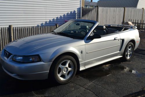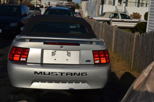 For sale a 2003 Ford Mustang V6 Convertible with only 74 K. It is the premium package. Has silver outside with black top, grey leather interior, air conditioner, premium package 6 cd player, Mach speaker has awesome sound, LoJack.