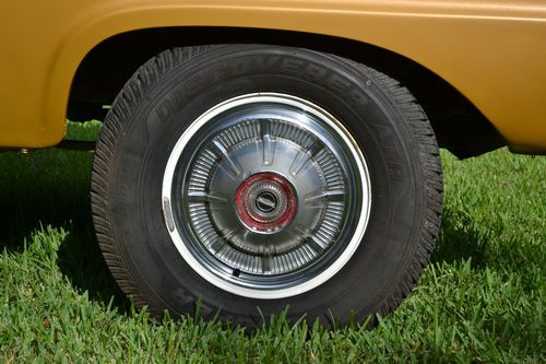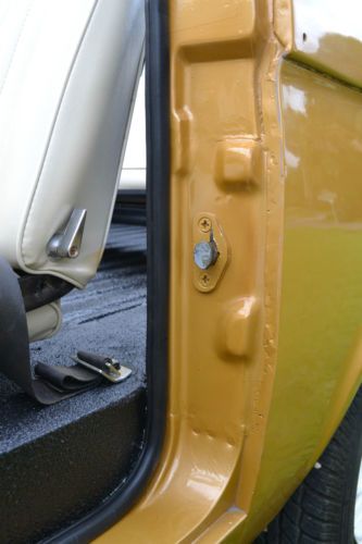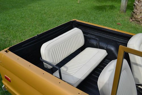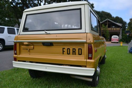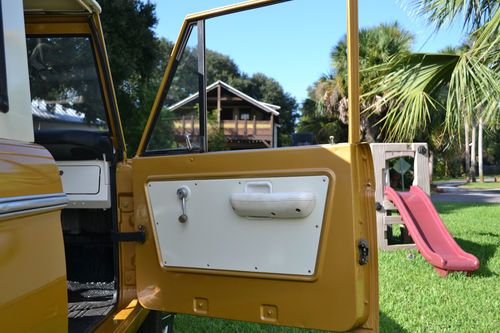 Prior to purchasing it there was some body work done and I picked up where the previous owner left off. I had a paint and body company do the work for me and they replaced one striker plate on drivers side and fixed several dents. This Bronco has minimal bondo for a 43 year old truck. There was a crude weld job done on the hard top on front drip edge. It can be seen in one of the pictures. There a few spots under the truck that have rust, but are not structural. A few dings and minor dents still exist, but over all looks beautiful. The truck is solid. I wanted to keep the truck as original as possible and painted it Color Code K which I believe is the original color. I also painted the rear wheel rack which is not shown and missing one of the hinges. Rhino guard was applied to the floor which is solid with no rust. The hard top inside and out, bumpers, and door panels were all painted and clear-coated when the truck was re-painted. There are a few rubber gaskets missing and the backseat does not have its armrest pads which are inexpensive to purchase.