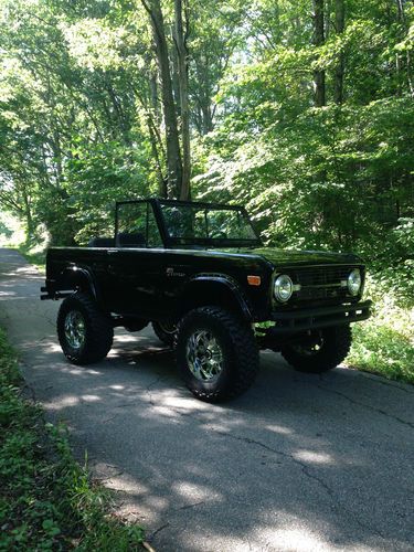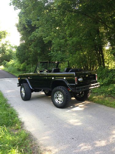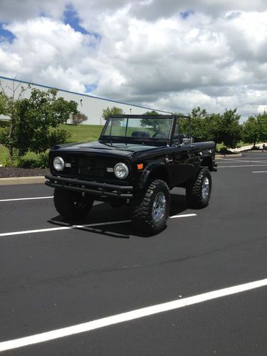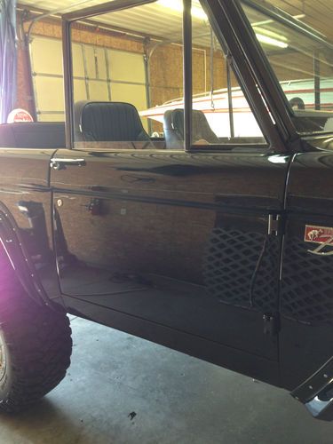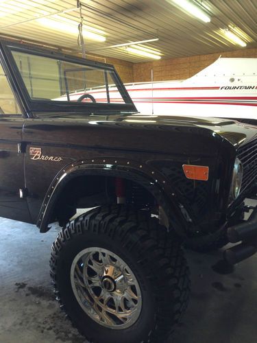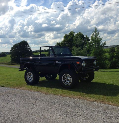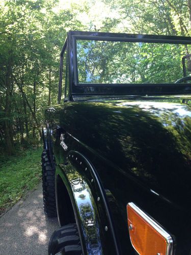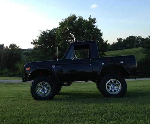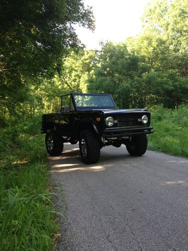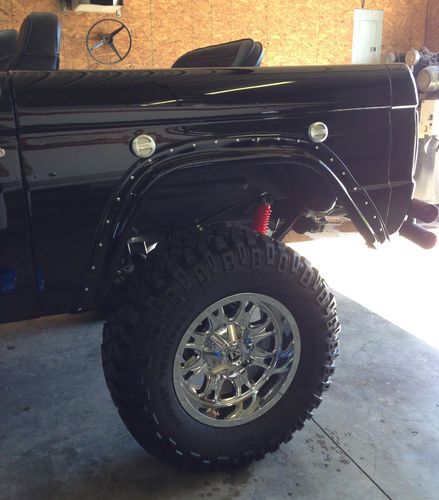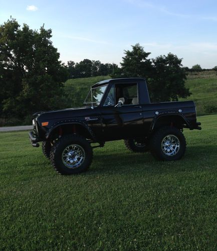 If you are in the market for a one of a kind custom Bronco that's a true head-turner look no further. This "68" half cab is one of the most fun rides I've owned; a perfect blend of classic nostalgia and modern styling. Black and beautiful the Bronco rides, drives, handles, and looks better than it did the day it rolled off the showroom floor. Powered by a Cropper Racing 383 chevy small block (Chevrolet engine; my power-plant of choice); performs flawless and sounds incredible through the Flowmaster super 44 mufflers. Engine dyno results were 468 hp 502tq @ 5500rpm and is built with Eagle rotating assembly topped off with Brodix aluminum heads and MSD ignition. Transmission and transfer case are Ford (bulldog) 4 speed and stock Bronco transfer case. The body started solid and was transformed into the lazer straight black panels you see pictured with billet accents and all new hardware and Smitty Built bumpers. The interior floor has been Rhino-Lined and fitted with new custom off-road seats; dash has been smoothed and fitted with billet insert and Autometer gauges, Ididit column and Lecarra thick grip wheel, a Tuffy console houses a Pioneer stereo and JL marine speakers. Complete wiring harness has been replaced with Cenco wiring kit; high performance lighting and LED tail lamps. Lifted with Wildhorses premium 5-1/2" lift kit (adjustable track bar) and disc/power brake conversion; Fuel 18" wheels wrapped in 35" Mickey Thompson MTZ's complete the madness! I really can't list in detail everything that has been done to this thing; it's pretty incredible. I have thousands of dollars in receipts and countless hours involved with the build; you honestly can't build it for what you can buy it for! Please message with questions; I'll be glad to provide a number for serious inquiries to reach me and discuss details. A few additional details: This is a first come first serve kind of business: As always: The Bronco is for sale locally and I reserve the right to end the auction at anytime due to local sale. Since this was built with no plans of ever seeing bad weather the heater and wiper motors have been deleted, but are included and can be installed; all required wiring is there to install. All gauges work, but the fuel gauge and speedometer are not calibrated. Buyer responsible for all shipping charges and arrangements; I will assist in anyway possible with the pick-up and preparation. Payment must be received within 7 days of auction end (I do not accept Paypal for large transactions such as this; cashiers check, money wire, or cash are the only methods of payment; payment must clear prior to vehicle shipment. ***If you haven't asked your wife yet; please do so before bidding!*** THANK YOU