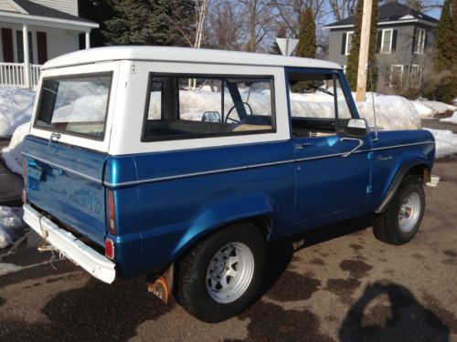 1969 Ford Bronco 4x4 with a 6 cylinder 170 c.i. engine and a 3 speed on the column. Runs and drives but has been inoperable for a few years now. Hi & lo range transfer case seems to work good along with all the lights and gauges. Brakes and exhaust need work to make road worthy. Tires are 50-60%. Does have rust in the rear frame rails, quarters, rockers and drivers floor. All problem areas have been patched over and could be used as is or this truck is a nice candidate for a restoration. The door posts, tailgate, and cowl look to be solid and original. Has been painted and has small dents and dings throughout the body with no major dents or damage. The seat is in good shape as is the door panels and dash. The windshield is cracked but the rest of the glass is in good shape. The top is also in great shape. Doors open and close nice along with the tailgate and hatch. The truck is located in northern Wisconsin and can be viewed and test drove anytime. Sold with a clean transferable wi title. |
