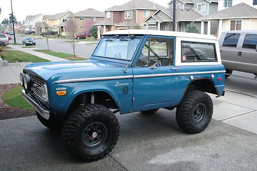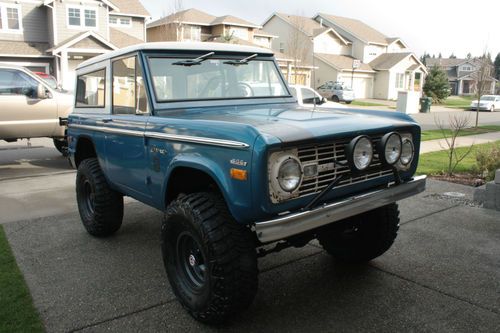 1971 Bronco, Recent Wild Horses 5.5 Inch Lift Kit, D44 front axle, Ford 9 inch rear axle, Reman 5.0, American Racing Teflon Moab with 35 inch MT/R Kevlar, Matching Spare, Reupholstered interior, new carpet kit, 3 speed floor shift. No major rust. Driver side floorpan replaced. New auxillary tank. Powder Coated roll bar and tire rack, Electric Cooling fan, Hella Fog lights. Complete Daily Driver.