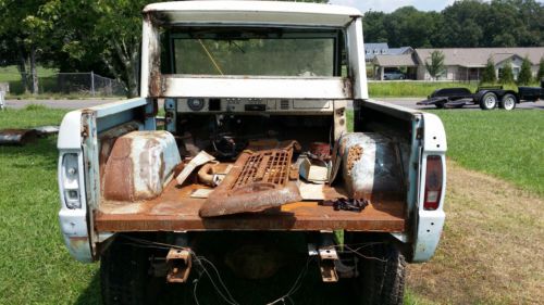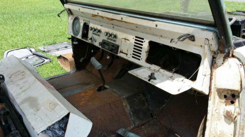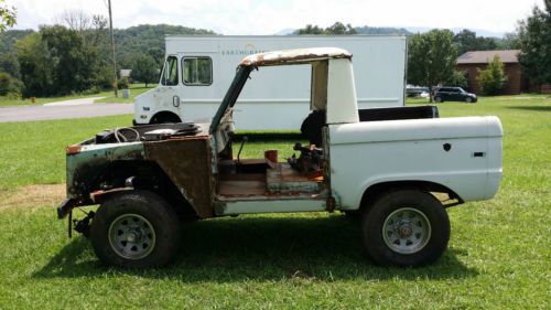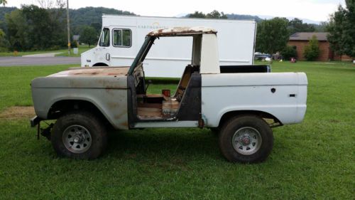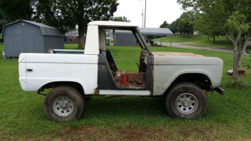 This is a 1973 Ford Bronco with a half cab top. This is a barn find and needs complete restoration. It has the larger 200 ci engine with a 3 speed manual transmission which was running at the time it was stored a couple of years ago. It has new pans installed but need to be finished. The fenders and hood are just sitting on it. There is no interior and the steering column has been removed to accommodate a floor shifter set-up. Comes with half cab that needs work and glass but is the steel half cab. Also comes with bulkhead, Soft doors in black and Roadster door inserts. It has a body lift kit and premium wheels. Comes with a later model power steering set-up as well. Study the pictures carefully because this is exactly the Bronco you are buying. You can restore or use for parts. Remember it has a good title. All parts that come with it are in the pictures. Hit the buy it now and make it yours now. Bid often and with Confidence!