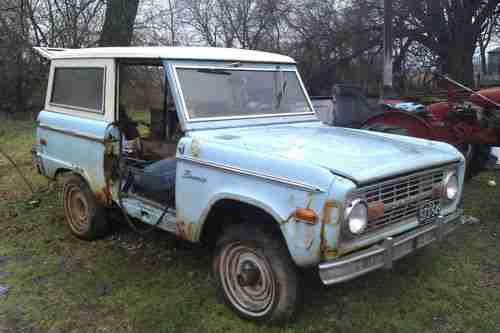 I have up for bid a rare 1973 Ford Bronco 4x4 with the Ranger trim package. This was purchased form the original owners, and had been in barn storage for the past 23 years. This Bronco features the original 302 V8 engine and automatic transmission. This is going to be sold as a project or parts vehicle due to the amount of rust that the body has in it. I have taken quite a few photos to try to give a good idea of what you would be getting. Both front fenders are very rusty, especially inside the door jams. Both doors are gone, not available. Even if they were still with the truck, there is nothing left to hold the hinges due to rust out. The tail gate is rusted out, as well as the inner rear fender wells. There are two large rust holes in the floor of the cargo area as well. The top/roof appears to be in very good condition and is not rusted out at all that I have found. The inner grill is in good condition, as well as the hood. The engine is not locked up, and with a little effort should be able to get it running. I have all four original hubcaps and also have the spare tire carrier. The rear bench seat is no longer with the truck. The front seats are in fair to good condition. All of the window glass is in tact and usable. The tires are all dry rotted from having sat for so many years. Three out of the four tires hold air. The left front will not take air. The rear inner side panel have been removed and are no longer available. The odometer is currently reading 09983, which I believe is going to be 109, 983 actual miles.