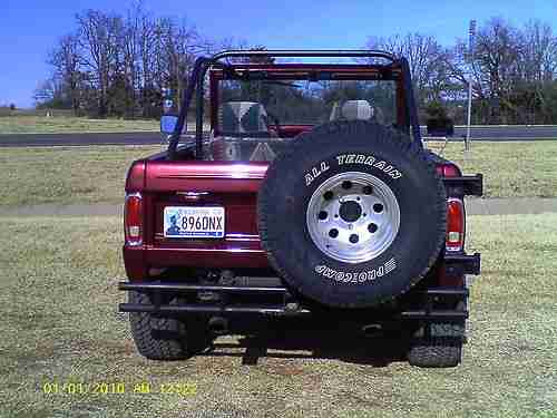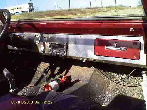 This truck has had a rebuilt C4 transmission installed with less than 5 miles on it. Has a fuel injected 302 engine with unknown miles. The engine has a recent tune up and runs excellent. Comes with a K&N washable air cleaner, new battery, fresh oil change. The fuel pump has been replaced less than a month ago. The running gear has been serviced front to rear and is ready to go. The interior has spray in Bedliner on the floor and sides, and was done correctly. This is not covering any rust. The seats need to be recovered, however all cushions are still in good shape. The dash is brushed aluminum with Ford aftermarket stainless guages. The truck has a tilt column, and all lights and turn signals function properly. The shifter for the transmission is a ratchet style floor shifter that is in good working order. The doors have had the interior panels as well as the glass removed. The truck has a nice roll bar that is in good shape. The spare tire rack is in good shape and swings easily and is not rotted where it attatches to the body. The front and rear bumpers are aftermarket pipe style and are in good shape. The hood is an aftermarket fiberglass hood and is in great shape. The body is really nice and the paint is in great shape. All interior and exterior paint matches and has no rust issues at all. The truck has fender flares that are riveted on and are in good shape and are not cracked or broken. The tires are Pro Comp 35 x 12.50 x 15". Tires are all in good shape and the spare is brand new. The wheels are all aluminum including the spare.