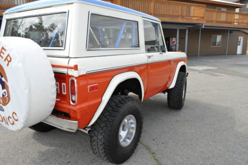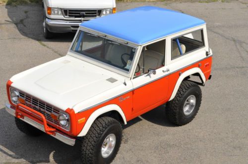 1975 Ford Bronco Denver Special. There were only 77 of these Broncos made and only 2 with these options. This is 1 of the 2 with rumors of its twin being crushed. I have spent two years gathering information on this SUV and it has a very interesting story behind it. Complete frame off restoration and it looks incredible. Numbers matching rig with some upgrades to the engine but mostly stock. When I bought the Bronco it had Black interior so the whole interior is brand new. I have pictures of every part, and pictures of the vin # on the frame. The Numbers on the engine identify it to be the correct motor so it is numbers matching. Very unique Ford with lots of money invested in its restoration. Complete powder coat and paint from the the frame up, lots of pictures and copies of the Deluxe Marti Report that backs up its history. A very nice and rare piece for a Ford Collector, or a Serious Denver Bronco Football Fan!!! I have spent two years doing the research and restoration work to bring this very interesting Bronco back. There has been well over 1000 hours invested in its restoration. Please email for specifics....