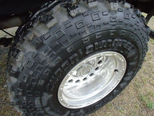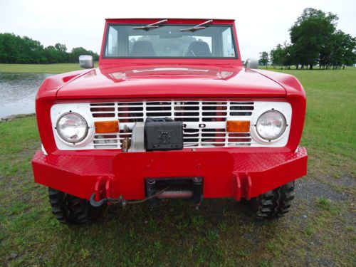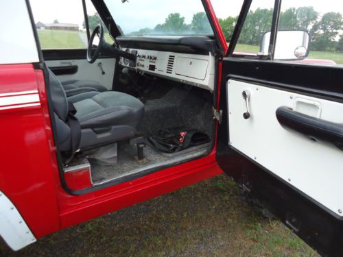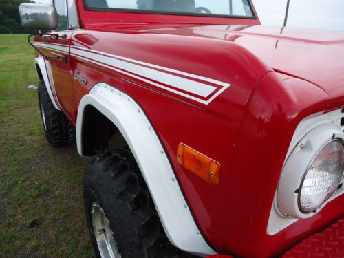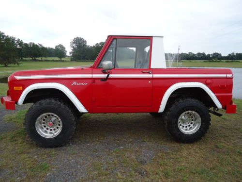 1975 Ford Bronco with metal half cab top this bronco is original full top witch has been conveted that can been taken off and put full top back on this bronco is a good driver has very good paint that has been redone in the past has nice shine new fender flairs new 33X12.50x15 super swamper radial tires on 15x10 aluminum stone crushers wheels has high back seats out of car the rust that is in the bronco is very small amount where floor pans in front turn up under pedals and only pin holes in the rest of the front pans kick panels rockers inner fenders door jams and in bed are all solid has model 8274 upright warn winch up front with awesome heavy duty bumpers the bronco does not have radio motor runs good holds 40lbs oil pressure it seems to be good rig just been setting and not driven much please look at all the pictures and have any questions please ask threw email or you can call or text me at 501-940-1213 if you need more photos i can text them to you.i want a 500.00 non refundable deposit 24 hours after auction and balance 7 days no eceptions! also i reserve the right to end auction at any time! not interested in any kind of trades or telling the reserve it has very fair reserve if interested please bid to win also if you need it transported i have a guy that can do so at very cheep rates thanks!!!!