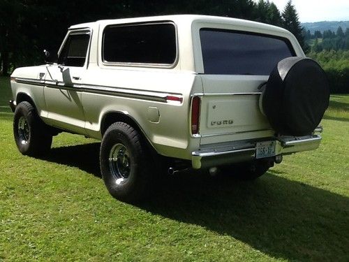 1979 XLT Bronco in great shape. This Bronco came from Eastern Washington. it has zero rust! It is a three owner Bronco. The original owner kept it garaged and maintained the paint. It is original and looks good. The interior is and 8 out of 10. Front and rear seats have been upgraded to Eddie Bauer seats, high backs with arm rests. Working air condition, working cruise control,very nice am/fm CD player. The driver side door panel has some cracks from age, rear panels are in good condition. It appears that the top has not been off. Factory swing away spare tire, rear back up lights, front fog lights, dual front shocks, newer Dura max dual exhaust with catalytic converters. They sound great. 351/400 all stock except for the four barrel intake and carburetor. Under the hood looks very clean but has not been detailed. This Bronco has not been around the mountain with a bunch of kid's tearing it up. All of the chrome , and original paint is in very good shape. The Bronco has not even been wax or detailed, it will look close to new with a professional detailing. It drives great, shift's solid. This is a hard thing to find, a 79 with no rust, very well taken care of and original paint. Sure it has a rock chip here and there but very few. I have sold two other Bronco's on eBay, one for $10,000 the other for $8,000. This Bronco is right up with both of them. Check my feed back bid with confidence. I have been collecting Bronco's for many years and this is that hard to find Bronco.
