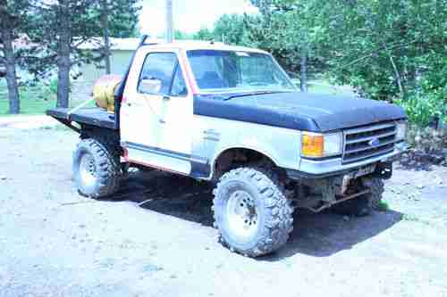 For your consideration is a 1982 F150 body mounted on a 1985 Ford Bronco frame. Front clip was off a 1991 Ford Bronco. Headlights need to be wired, and front clip needs to be finished bolted on. It has 4" SkyJacker lift kit, Rancho shocks, 33 x 12.50 TSL Super Swampers, and Obeco Flatbed which has been shortened to fit. Engine is 351 Windsor with a performer intake and Holley Truck Avenger carburetor. Truck runs, no major leaks or mechanical problems. Selling to thin out projects.