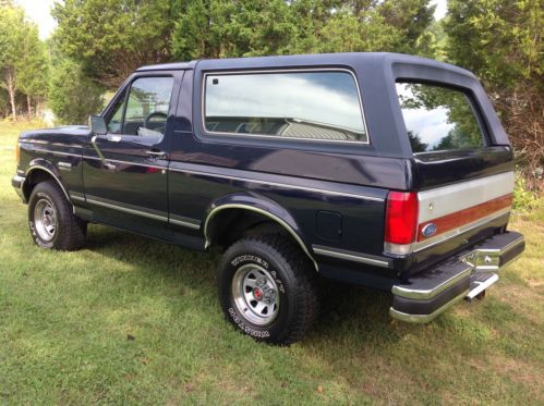 1989 Ford Bronco XLT with 77,000 original miles. The truck is unbelievably clean and super nice. It has only had two owners and has been garaged kept its entire life. It runs and drives great. It is equipped with the 5.0 Motor. The engine could not run any better and the transmission shifts perfectly. The front end is very tight and the truck drives very true even at 65-70 MPH. Everything works on the truck including the cruise control, air conditioning and power windows and locks. The passenger side door lock sometimes does not activate but the drivers side always works. The rear window works at the switch and at the tailgate. The carpet and the seats in the truck are in like new condition. The original AM/FM Cassette works great as well.