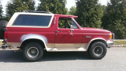 Thank you for viewing this listing for a 1990 Ford Bronco Eddie Bauer. It has the 302 5.0L V8 gas motor with 155,000 miles on it. It is an automatic. It has meaty 33" Mickey Thompson Baja Claw tires including the spare. The top has been off and makes this truck tons of fun in the summer. It is priced to sell now before the 4x4 demand rises once winter is here. The 4x4 works great. The only reason it has a low AutoCheck score is because I am the 6th owner. All of the electric windows work including the rear glass. There is rust as you can see in the pictures and the start of some bondo repair on some of it. There are many new parts including: Exhaust - full tune up(including cap rotor, wires, plugs, oil and air filter) - belt - brake lines - fuel tank & pump - power steering pump - battery It runs well but there are some issues. After driving for a while, the oil pressure gauge drops when the RPMs go below 1,000 (like when idling at a stop.) So there is definitely an issue with the oil pressure which is probably the oil pump. It also leaks oil. It is not the rear main seal, I had that done 2 years ago. The automatic transmission works well when not in overdrive. When driving in overdrive at slow speeds, it will slip. I just use it in drive around town since it wouldn't normally shift into overdrive anyway. Feel free to come to check it out in person and I can show you everything. Feel free to ask any questions and completely inspect it before you take it home. Send me an e-mail with your phone number so can set up a time to check it out. I have MANY more pictures and can send you a link to them if you e-mail me. I can work with a shipper that you hire but since this is being sold as is, please make arrangements to see and inspect it prior to placing a bid. On Aug-30-14 at 12:44:04 PDT, seller added the following information: