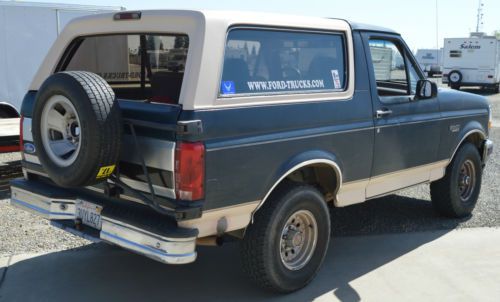 Selling my 1993 Eddie Bauer Ford Bronco. Owned it three years, and love it, however, I need to get something with better mpg. Don't let the 242k miles fool you, this engine is still plenty strong and does not smoke at all. It does have a small oil leak on passenger's side of engine. Have replaced battery, spark plugs, spark plug wires, distributor cap, and rotor, along with an oil and filter change about 6 months ago. Air filter was changed then also. Replaced all three power window motors. Installed a five panel rear view mirror, and upgraded headlight housings. Tires still have 80% of the tread on them, spare tire is a used one from a local junkyard. May want to replace that one. Replaced cracked and torn front leather bucket seats with cloth ones from an F150. Rear seat is still leather. Front hubs replaced with Warn manual locking hubs. 4x4 system works great. Been to Pismo Beach 3 times, and Cleghorn, and Ballinger once each. Starter and both solenoids replaced six months ago also. Have made numerous trips to So Cal with no problems. It has a factory towing package, which includes a transmission cooler, and the hitch ball mounted on the bumper. It has an old 6 plug trailer connector, but I will include the adapter to tow a U-Haul trailer. Kenwood speakers replaced six months ago, and a Viper alarm. Headliner is in perfect condition, and carpet has no rips, but does have some stains. Can remove decals on rear side windows before new owner takes possession. Have title in my name in hand, and just registered vehicle til April of 2015. Also, can deliver vehicle within a 500 mile radius of Fresno for the cost of gas (at present prices, figure a dollar a mile) as I have an F350 and car trailer. Am still using vehicle as a daily driver so mileage will keep going up until sold. Just installed fuel pressure regulator, and air temp sensor. Rear window will go up and down with no problems, however, only with the dash mounted switch, it will not work with the key switch in the rear door. Please don't hesitate to ask any questions about the vehicle.