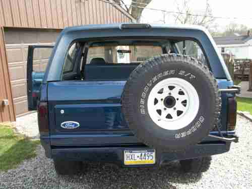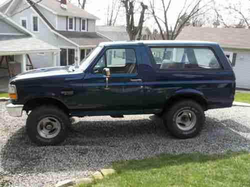 For sale,1994 ford bronco xl,vehicle came from florida and has a clear history with no major accidents reported.Body is very clean with no rust through on floor pans and only slight surface rust on frame,doors,fenders,and quarters are super clean.Tailgate shows very minor bubbling at lower area but inner lip and jam is solid.Interior is in great shape showing minor wear on drivers seat, dash is not cracked and looks great,four wheel drive works excellent, front end has been completely rebuilt has had all the brakes rebuilt, completely tuned up and all fluids have been changed.Truck was professionally repainted summer 2012 with basecoat clearcoat all PPG products.preveosly stated truck came from florida where it lived its whole life.Truck has had new tires all around in january 33x12.5x15 cooper discoveries ,this truck is a strong 8.5 out of 10 gets alot of looks its nice enough to wash and wax but you aint got to worry about getting it dirty.Interior floors have been sanded and refinished with spray in bed liner to protect against rust.