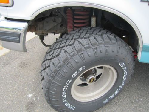 YEAR: 1994 MAKE: Ford MODEL: Bronco TRIM: XLT MILEAGE: 158,000 COLOR: Blue/White TRANS: Automatic ENGINE: 5.8L V8 DRIVE: RWD 4X4 This Bronco has a solid 4 inch suspension lift with brand new 33x12.5x15 A/T Goodyear Wrangler Duratrac tires. Trailer hitch and push button 4x4 with manual locking hubs. Power windows, power side mirrors, captain's chairs with lumbar support, A/C, Hella brand off-road lights, and brand new Alpine stereo with aux/usb/iPod hook-ups. Dual exhaust piped straight out the back (sounds really good). Did some front end work before the new tires went on. New spindles, lock nuts, bearings, and manual locking hubs (4x4 hub assembly). New upper/lower ball joints, inner tie rod, steering gear box, pitman arm, and alignment. It has a slight oil drip. A few scratches, small dings, and some paint flaking off tailgate by roll up window. These things are common for a twenty year old truck and by comparison this Bronco is in really nice shape. I'm gonna miss this truck. Just look at how clean it is, no rust. It sounds great and is really fun to drive. Everything works great. You can drive it anywhere. It has plenty of horsepower for towing or going up the highway in the mountains. Great clearance for 4x4 trail running and lots of cargo space for camping trips. *Vehicle is sold as is *I resevre the right to end auction early if sold locally.