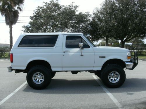 Hello, with regret I am listing my Bronco for sale only because I have to many collectibles. This beautiful Bronco looks and runs great. It is my daily driver and is dependable and solid. Very well taken care of by someone who loves broncos. This is the last year Ford ever produced the Bronco and this is a Rare find. It is an XL with automatic locking hubs, manual 4X4 shifter on the floor, rear window defrost, Cruise Control, center console, cloth headliner and the last year of Ford's legendary 5.0L V8 motor with only 109k original miles on it. My wife loves to drive this Bronco to the grocery store and I would not hesitate to take it anywhere. This truck does not leak a fluid of anything anywhere. Oil and oil filter always changed every 3,000 miles. Meticulously maintained. Southern rust free truck. Always a Florida truck.. I am the second owner. Look at the pictures of the door jams, tailgate and under carriage. Clean collectible bronco in and out. A/C is ice-cold. Pro Comp 6" full suspension lift, using coils in the front, dual steering stabilizer and leaf springs in the rear. Professionally installed by Ideal Automotive, there were no short cuts taken with this truck, even the rear sway bar was used (I have never seen or heard of a Bronco in which was lifted and the original rear sway bar was used) which is another option this truck has. NO BODY lift was used, I dont believe in body lifts, I think that is the cheapest short cut way of lifting a truck. Nothing was spared with this truck, money was no issue as I wanted it done rite. Wheels are 15" Eagle Alloy (bought from Eagle Alloy directly) tires are 35x12.50 15 LT Bfgoodrich All Terrain tires. Including full size matching spare rim and tire. Brakes are new all the way around, new OEM Ford rotors and rear drums. Wheel cylinders, hardware kit, front including all bearings and seals. At 100k truck received a full tune up, only because I am meticulous (clearly by the pictures of this Bronco). All new OEM Ford parts, as mentioned nothing was spared. New spark plugs, wires, cap and rotor. New fuel filter. Air filter was changed every oil change. New interstate battery. All new hoses and belt. New fan clutch, belt tensioner and idler pulley. Everything mentioned OEM Ford from the Ford dealership. Stainless steel exhaust. Pioneer am/fm cd stereo. Speakers sound great. Original winch bumper and Mile Marker hydraulic winch with remote. Winch and winch bumper have been on the truck since 1996. As you can see from the pictures not even the winch cable or the winch fairlead roller is rusted. If you have any further questions please feel free to ask. This Bronco needs nothing and will make the next owner proud.