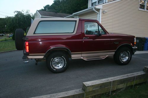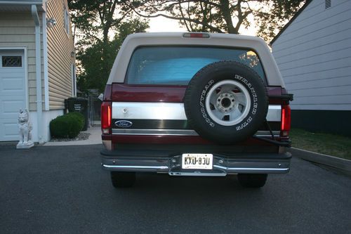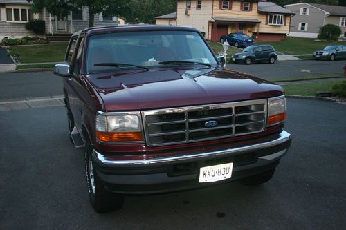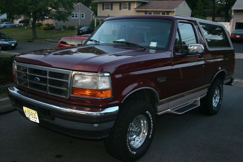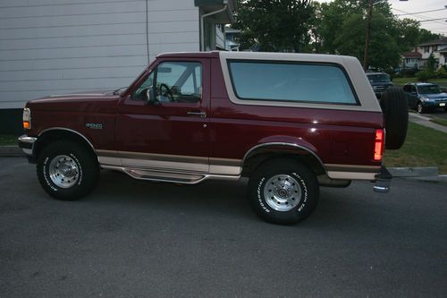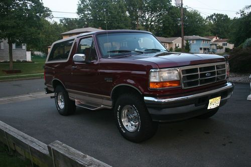 If you are looking for a Ford Bronco then you can stop looking. I am finally selling my 1996 Eddie Bauer edition Ford Bronco. This is the one that everyone everywhere I went always admired and complimented me for. It is most likely the best and cleanest example of this truck around. I have had it since new, although I am the second owner on title. I even still have the original window sticker! It is almost 100% rust-free! If you know your Broncos then you know that in of itself is a miracle and rarity. It is Toreador Red with a still almost-new look and shine with the Eddie Bauer leather package. It has oversized tires which I just put on about 20 thousand miles ago. The truck only has 110 thousand miles on it in total and I have all the records since new. Lots of stuff has been replaced like fuel pump, oxygen sensors, new brakes, radiator, arm bushings, windshield, EGR valve, etc. (All stuff that kept the truck running perfect!) I love this truck and will be very sad when I sell it although the time has definitely come for me to part with it. It is the upgraded 5.8L V8 engine also! Power everything and 4x4 capabilities. Never get stuck in the snow again! I am letting this car go at ONLY $7000 which is probably a steal when I see the condition of all of the other Broncos out there for sale. If you are a true Bronco fan then you know what I am talking about and you will run at the chance to buy this truck. Call 908-233-1185 (work) or 908-514-5846 (cell) and ask for Frank. The truck can be seen in Westfield, NJ