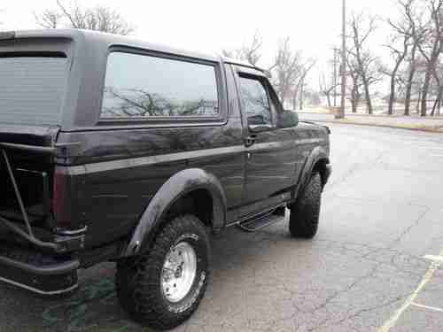 This is my 1996 Ford Bronco! I've driven this truck EVERYWHERE! It runs and drives out beautifully. The engine is a 302ci 5.0L V8. The engine was rebuilt in April of 2011. It has roughly 18,000-20,000 miles on it since then. It also has a new distributor, ignition module, plugs, wires, fuel pump, alternator, and A/C compressor. The transmission shifts out great and was rebuilt in January of 2011. Roughly the same mileage on the transmission as on the engine. It has a 3.5" suspension lift with Skyjacker shocks all around. All ball joints were replaced during the lift as well as the rest of the front end components. Has a locker in the front differential. Warn manual hubs on each wheel. Straight flowmaster exhaust with dump downs on the muffler. Goodyear Wrangler Duratrac A/T tires in like new condition. New drilled and slotted rotors in the front as well as new wheel bearings and pads. Rear brakes have new drums, wheel cylinders and shoes. This Bronco drives like it's still brand new because basically it is. I've taken very well care of this truck and it has had its maintaince done during every scheduled time. Every 3 months the oil would get changed out even though the mileage wasn't close to 3,000. If your in the market for a slick looking 4x4......I'm telling you THIS IS THE ONE!!!! Drives like a dream and Rides like a dream! 4-wheel drive is strong and never has been abused!! The front 3-piece headlights were replaced with one unit lights and silverstar bulbs. I think it sets the front end of this truck off! Also has Bushwacker fender flares on each wheel well. 15% tint all around the windows and a visor on the roof!!