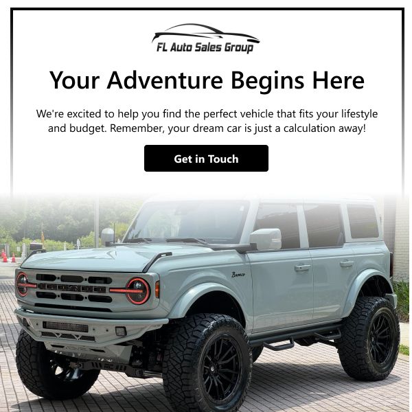 Florida Auto Sales Group specializes in custom Broncos for sale. We offer nationwide sales and modifications, with many buyers from out-of-state locations like NY, CA, TX, and VA. Whether you’re searching for a new Ford Bronco for sale or want to customize your vehicle with performance upgrades and bold designs, we provide a tailored shopping experience. Shop our inventory online or build your custom Ford Bronco. We offer trade-ins, financing options, and nationwide shipping. Schedule a test drive or start your custom build today!