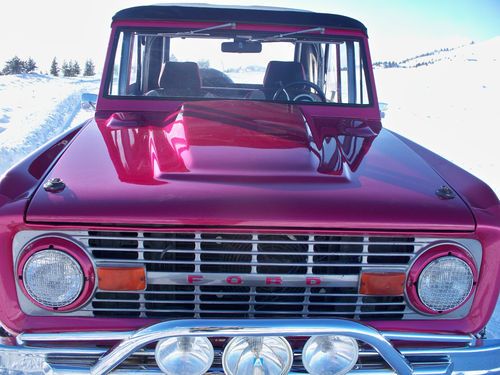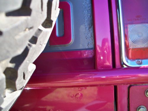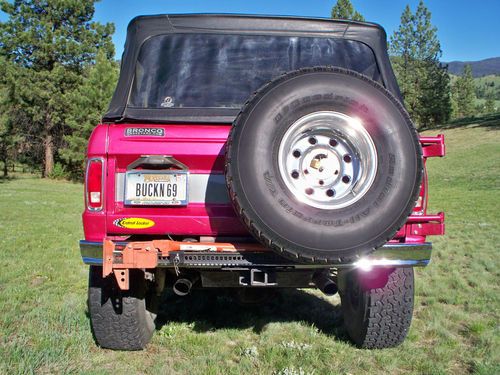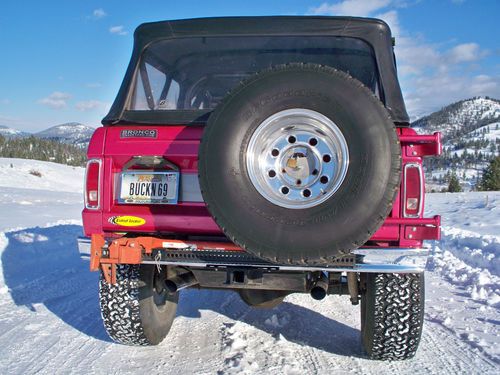 The Dual Flowmasters and H pipe produce an amazing deep rumble that sounds great. The frame and engine compartment (including the inner fender sections) are Rust Free. This truck has lived its life in Montana in a dry climate. However; there are a few minor spots of rust starting to present themselves. There is surface rust on the lower right side of the tailgate (pictured), near the left side rear marker light (pictured) and on the door jams (pictured). The rocker panels do NOT have rust present (also pictured). The cranberry color is beautiful and the tribute pink is pleasing to the eye. Even so, the stitching on the seats could easily be redone if desired. The magnetic pink ribbons on the exterior are also easily removed. This is a unique custom Bronco that would cost a fortune to build again. The reserve is not even close to what is in the truck, so good luck to whomever the lucky winner may be. This truck has won trophies at car shows but it is not a flawless "show car". It is a driver that presents very well. The only known mechanical issue is that the shift shaft seal on the C4 automatic has a small leak. The leak will produce a baseball diameter sized spot of fluid after sitting in a garage for six months. Very minor issue I realize, and therefore it has been nothing that I have bothered to look into, but it needs to be noted. Even though picking up the Bronco will be the responsibility of the buyer, I will do my best to arrange my schedule to be available for any shipping arrangements that are made.