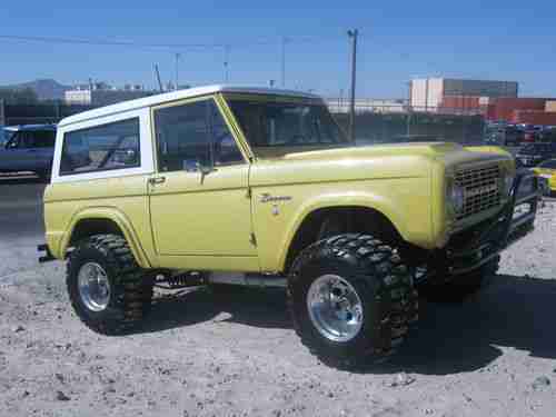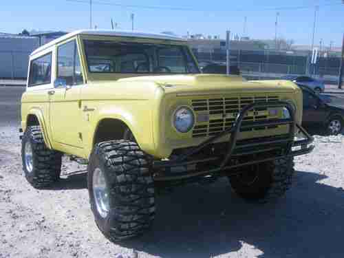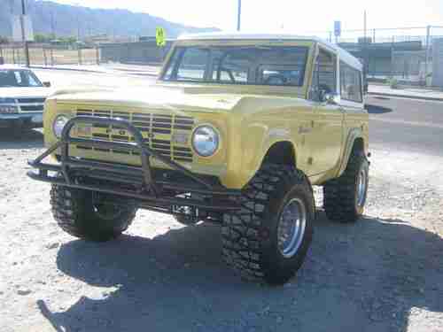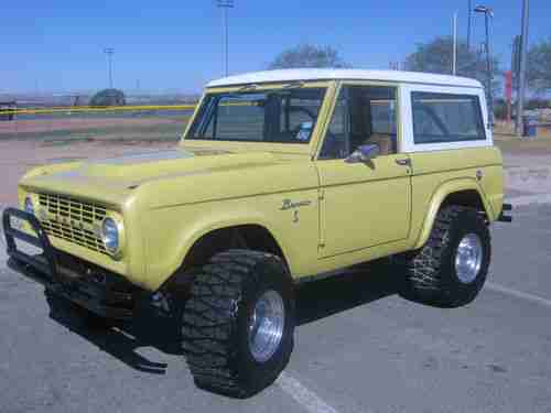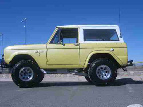 Power Steering, Front Disk Brakes, Rear Drum, K&N Filter, Fiber glass Hood, Platinum 2 Chrome drive shaft & Super Comp. chrome ladder bars. Front Axle Dana 30 with chrome cover, 9” Ford rear end and a Rebuilt bullet proof Dana Spicer Model 20 Transfer Case. The 7 Year old Pearl Yellow Paint but still looks very clean inside and out, nice Carpet, Original style seats done in saddle Tan, Tube bumpers front and rear with Full Roll cage,Locking front Hubs, JVC CD player with remote. Everything works all lights blinkers and instruments work including the windshield wipers. There is no major rust or body filler ever. This is a desert southwest Bronco that runs strong looks great and is a blast to drive on the street, at the lake or desert 4x4ing with family and friends! The Nice thing about having a powerful fuel injected engine it can climb anything with no worry about a carburetor killing the engine out dry because your on a hill which happens when you have a carburetor.