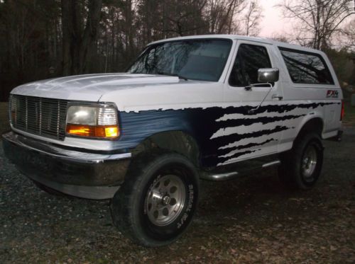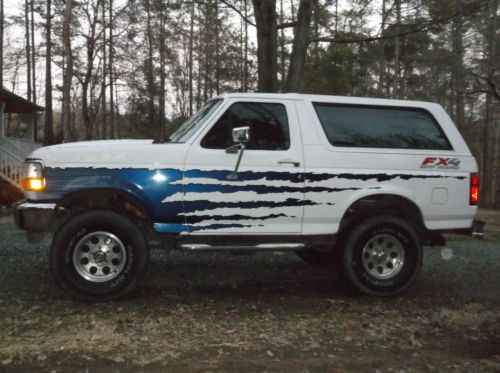 This is the next to the last year for the big Broncos. It has custom paint, cowl induction hood, flowmaster muffler, Griffin aluminum radiator, manual lock out hubs 5.0 fuel injected engine (good gas mileage and power), auto trans, cold ac, Sony cd player, Reese style hitch, trailer brake controller, chrome step bumper, billet grille, alloy wheels, 35" tires, 3" body lift (rubber extensions to stock body mounts that are easily removed), chrome tube steps, fold and tumble rear seat, front brakes recently replaced. My wife drives this Bronco often and I would not hesitate to take it anywhere. The good:) The truck starts every time and runs well. I have taken many trips and never had any problems. It runs cool in all traffic with the Griffin radiator (custom built for this truck). The 4wd works well. The lock out hubs give less wear on the drive line than full time 4wd. The lift is body only and easily removed. The power tailgate window works well, but I am missing the key for the rear and you must operate it from inside. You can replace this easily, I just use the inside switch. The suspension is stock and so it handles well. It looks even cooler in person than in the pics! If you don't want to be noticed, this is not the truck for you! The Bad:( I recently hit the driver side with my trailer and left a small dent over the tire, easily repaired, I haven't had time to take it. There are some small dings and scratches normal to a daily driver, but not many. There is some minor brake dust discoloring on the front wheels which may polish off. Recently, a few small rust bubbles have shown up on the bottom of the tailgate. This is the only rust I have found. There is a small bad place on the side of the drivers seat. The tires need replacing. This isn't a show truck, but it could easily be one! Vehicle is for sale locally and seller reserves the right to end auction early, so the more quickly the bids reach my reserve, the more likely you are to win the Bronco! One last thing, I am not a dealer, but my father is. I would like to let him do the title work. There will be no charge to the buyer for this. |