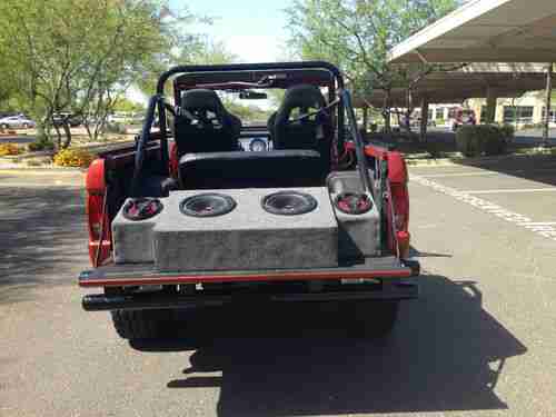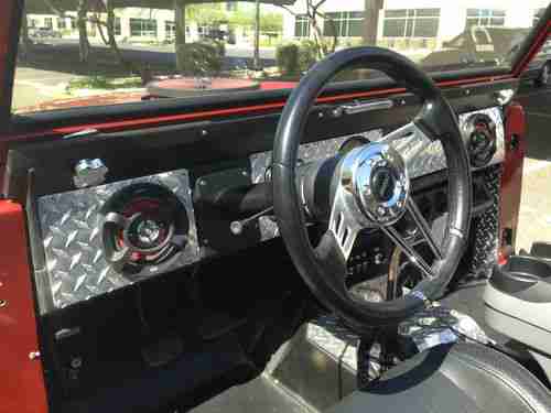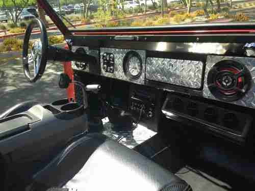 Soft doors, Wild Horse bikini top and BestTop full soft top, both are in great shape. Interior has 4 point harness seats. Rear roll bar. Floor boards are rhino lined and rust free. Front floor boards were welded over top of old by previous owner, so doesn't look as good underneath. Instrument cluster works well with exception of amperage which cannot read the electronic ignition. It read the previous stock ignition fine. Diamond plating on the dash and center floor boards. Heater system. New windshield wiper motor. Headlights are Halo high output. Headlights, taillights, blinkers and emergency lights all work. Electrical is solid and I have schematics. Kenwood KDC-252U Stereo with auxilary cord runs 1000 watt Sony Xplode amplifier and Sony Xplode speakers, 2-10 inches and 2-12 inch subwoofers. This stereo system absolutely thumps, every highschool kid's dream, 80mph on the freeway and loud. Note the instrument cluster is moved to the center of the dash to make room for the front speakers. So much easier to read than having the cluster on your left. Hurst shifter, 3-speed on the floor.