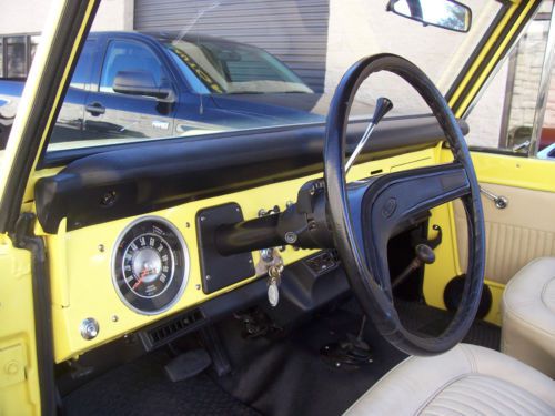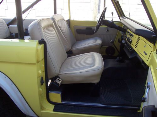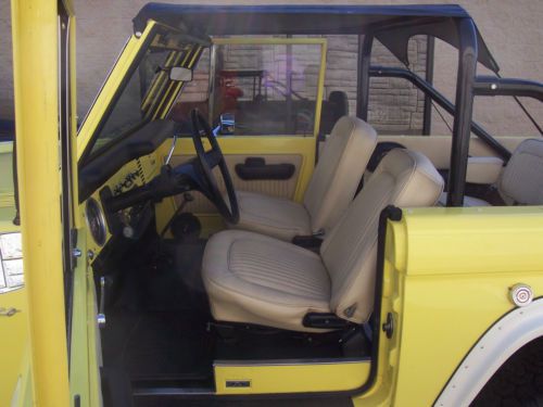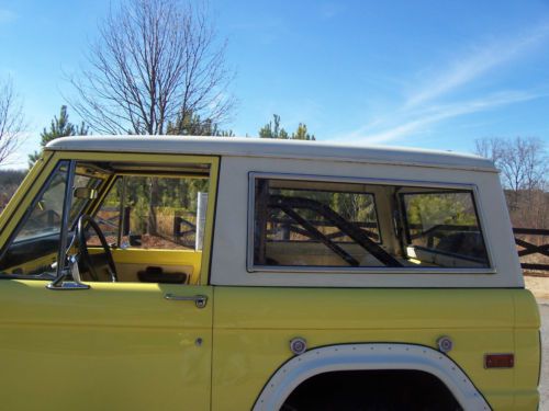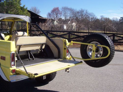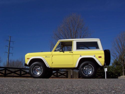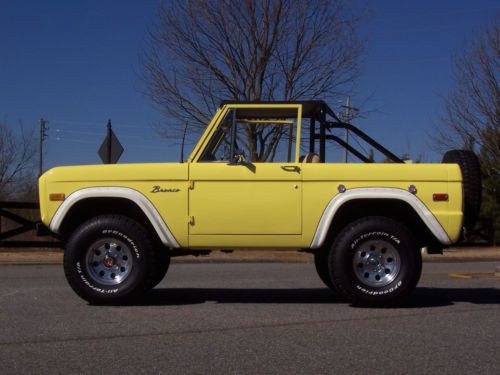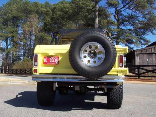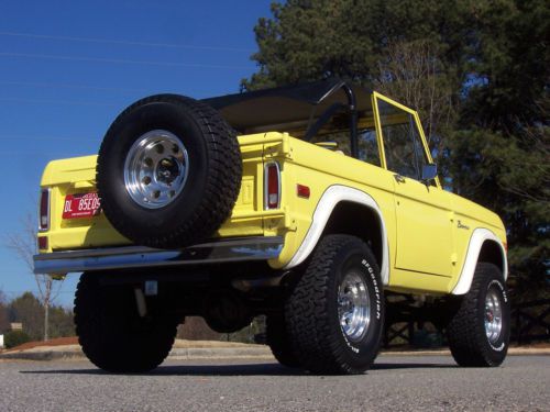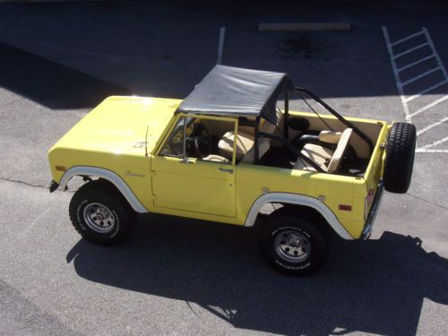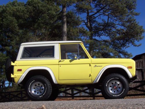 HAVE YOU BEEN SEARCHING FOR A HIGH QUALITY, EYE-CATCHING EARLY BRONCO CLASSIC? WOULD YOU PREFER ONE THAT LIVED MOST OF ITS LIFE IN CALIFORNIA AND WAS RUST FREE BEFORE IT WAS TREATED TO A PROFESSIONAL RESTORATION AND WAS BUILT TO BE DRIVEN AND ENJOYED? DO YOU LIVE IN A CLIMATE WHERE ICE-COLD AIR CONDITIONING WOULD BE A NICE OPTION TO HAVE? DID YOU TELL YOURSELF THAT YOU WOULD MAKE SMART INVESTMENTS IN 2014 AND LIVE LIFE TO ITS FULLEST?? WELL, IF YOU ANSWERED YES TO ANY OF THE QUESTIONS ABOVE THEN THIS MAY BE THE EARLY BRONCO CLASSIC YOU HAVE BEEN WAITING FOR!!! THIS SUNSHINE YELLOW BEAUTY IS ONE YOU REALLY NEED TO SEE!! As you will see in the pics below we currently have an amazing selection of Early Bronco Classics in our inventory...if one of the other Broncos pictured interests you feel free to give me a call for more info. This Yellow '76 Bronco is truly a great find and stands heads and shoulders above most others on the market. This restored Bronco looks awesome inside and out and drives beautifully. Loaded with Power steering, power disc brakes, Air Conditioning, CD Stereo, and more!! There is no denying that these Early Bronco Classics are becoming highly sought after in the collector market and rightfully so. If you are looking for the ultimate sunny day cruiser, beach or mountain fun ride, or just a classic 4WD investment vehicle that will be right at home at any car show or cruise in, then this is the one!! I will do my best to provide enough large images, a video of it running and an honest description to help you decide if this Bronco belongs in your stable. Sit back and enjoy!! This Yellow beauty is a Bronco that is a bit more familiar to me then some of the other Early Bronco Classics we have had had in our inventory. The reason is that this is the 2nd time we have owned this awesome classic. We originally acquired this gem a little over 2 years ago from a guy who had recently moved to Oregon after living in California. He had purchased this Bronco about 6 years prior to that from the gentleman in California who had the high end restoration done. The story was that this Bronco had lived its entire live in Southern California. The original DSO code is 71 which was Los Angeles and when it arrived to us it was obvious this Bronco had lived a great, rust free life. This was actually only the 2nd Early Bronco Classic we had owned and it sold quickly to a great guy in North Carolina who was in the Military and was looking for something to enjoy with his wife and kids on sunny days. He did so for 2 years but then found out he was being deployed to Africa for at least a year. He called me and the following day I wired him payment and made arrangements to bring this beauty back to the Atlanta, GA area. She looked just like she did 2 years prior....gorgeous!! This baby is going to absolutely thrill the next owner and it truly drives and handles as good as it looks! Maybe that lucky person will be you?? As you will see in the pictures below the body is in amazing condition. Keep in mind the restoration was done about 9 years ago but as you will se it has held up beautifully with little sign of age. When it was restored the color was changed from a Ginger color to the eye-catching Yellow. This Bronco just looks right...perfect for the beach, summer cruises, mountain drives, local car shows and cruise-ins or trip with the family. I do not see any signs of rust repair and the body appears to wear all of its original sheet metal. Body panels are extremely straight and line up beautifully. Weatherstripping was all replaced at time of restoration. White fiberglass fender flares accent the yellow body nicely. Paint quality is awesome overall and the only real flaws on the body are the same ones it had 2 years ago which are a few minor chips that have been touched up. Windows roll up and down nicely. There are 2 small rock chips in the windshield that were there 2 years ago and are not a big deal. 4-point roll bar looks great. This was an original Ranger edition which included additional chrome trim around the windows, hard top, and grill area. Chrome trim, emblems and bumpers look great with just minor wear to the rear bumper chrome. Overall, as you will see, this Bronco is ready for the shows where it will win plenty of trophies if that is what you enjoy, or just drive and enjoy! Here is a walk around tour of the body: These Broncos are a blast to enjoy with the Hard top removed and driven as a convertible. We always remove the hard tops and drive and enjoy them with a Bikini top as often as possible. This Bronco does look great with the hard top on if needed as you will see in the pics below. The hard top is in overall very good condition however it must have had some lights installed many years ago as there were some holes on the top which were repaired but the top was never fully refinished so if you want it to look as good as the rest of the Bronco it would need to be finished and repainted. The glass and chrome trim are in great shape. If you do not think you will use the hard top we would be willing to include a new White soft top instead. This will be up to the buyer. We also will be including the black Bikini top that you see pictured as well. Complimenting the beautiful yellow exterior is a great looking off-white stock interior. Seat covers are in fantastic condition and very comfortable. Door panels both front and rear look great and stereo speakers were professionally installed throughout. The floor of this Bronco has a great vinyl mat that was installed years ago which makes it really easy to clean out after a day at the beach. dash pad looks great and original steering wheel has a nice leather wrap on it. All of the gauges and lights are functioning correctly. When we sold this Bronco 2 years ago the speedometer was jumping around quite a bit. The gentleman who bought it decided to replace the speedometer with a rebuilt original from Toms Broncos and it was set at zero miles w