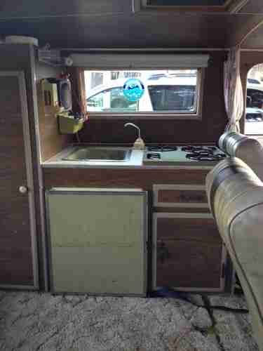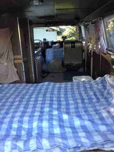 1969 Ford Econoline Camper Conversion RV. Auxiliary gas tank. 3 burner stove, sink with hand pump, icebox. Dinette (needs cushions) in rear, converts to bed 4' x 6'. Has closet, cupboards, drawers. Additional storage under dinette seats. Porta-potty, tire chains included. Custom folding 3rd seat with seatbelt included. 165K miles since professional rebuild. 3-speed manual transmission (rebuilt once). Rear axle (rebuilt once) is noisy. Oversized radiator. Currently registered, has plenty of pep. No "power" anything. No smog (California) required.