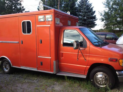 1995 Ford E350 / ambulance custom orange paint used for a work vehicle for a painting company. It has 106k and the motor was recently replaced with one with about 80k.It has had a parasitic draw if i sits for a few days the battery will go dead but if it is driven daily it is ok. The brakes have been checked out many times for a low petal and many parts replaced the petal still seems low but every machanic seems to think there is nothing wrong. this is a great work vehicle with plenty of seating and storage. I am selling this for a friend and will do my best to answer any questions. This was used for a work vehicle and buyer it expect to see wear and tear with cosmetic blemishes since it was used as work vehicle. Any Questions call 508 278 6767 8am 5 pm