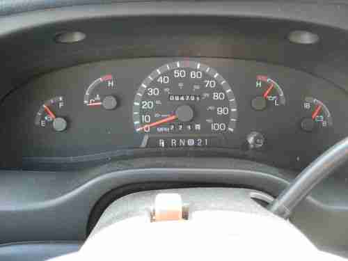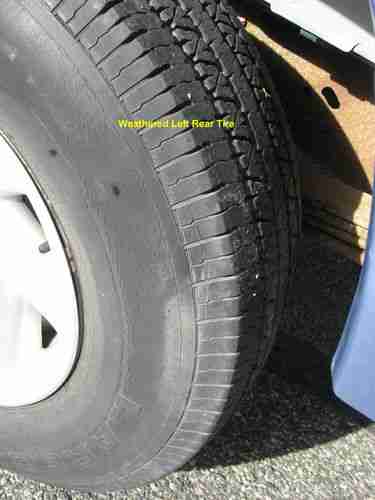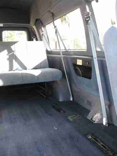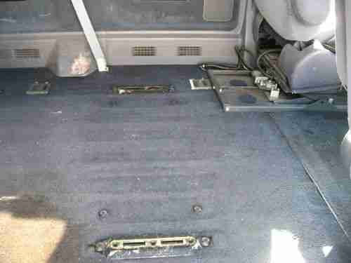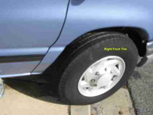 This vehicle starts and runs good. The tires have good tread, but both rear tires have a lot of weathering and should be replaced. The windshield has a small stone chip. The drivers side interior panel has been damaged by a wheel chair (you can see that in the picture). The spare tire and original center seat are in the back of the vehicle. The radio has been updated with a JVC CD player. The radio sometimes turns itself on while driving, the seat belt warning also sometimes comes on while driving. The outside has some minor parking lot chips and dents, typical with the age of the vehicle. No wheelchair tie downs are provided.