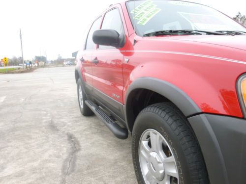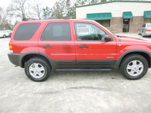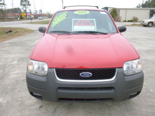 Up for your consideration is a beautiful 2001 Ford Escape XLT SUV. This beauty has Red exterior with no dents. I can't see any scratches. The paint looks new. It is bright and shinny. The interior is all grey leather with power seats, windows, cruise control, power locks, stereo, CD player with cassette. No holes in seats front or rear. No cracks in dash and no cuts in carpet or smells. Sun roof as well. 3.0 V6 EFI motor. Very good on gas. Vehicle has a clean car fax. No mechanical issues. No oil leaks. No smoke at start up and the tranny shifts as it should. No warning lights on the dash. This is one of the nicest used vehicles I have ever seen. With only 94000 miles that's only 7300 miles per year. This vehicle was babied. The pics speak for them selves. Michelin tires. Bid with confidence. Call Alan @ 843-997-7378 with questions. This vehicle is being offered locally so I have the right to end this auction early if it sells. Thank you for looking.