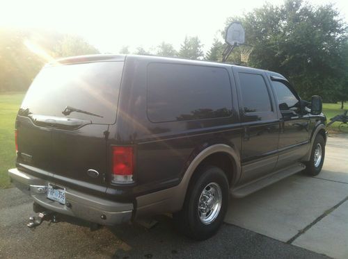 This is a 2000 Ford Excursion with a 7.3 liter diesel engine. It is in good overall condition. The exterior is in good shape with no major dents. It does have some scratches and some small dents. The interior is in good overall shape with exception to the 2 front seats they have heavy wear and a tear in each one. It has an in dash 6 disc dvd changer and an over head monitor for the rear seats. It also has a direct connection point in the glove box for an IPod. I drive this vehicle daily and have and would again go anywhere in it. I average around 22 miles per gallon on the interstate on long trips. It is great for traveling with the family.