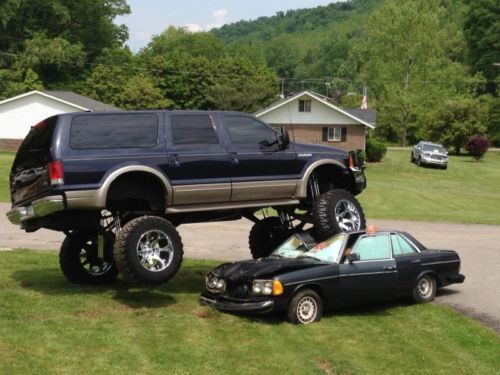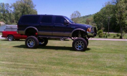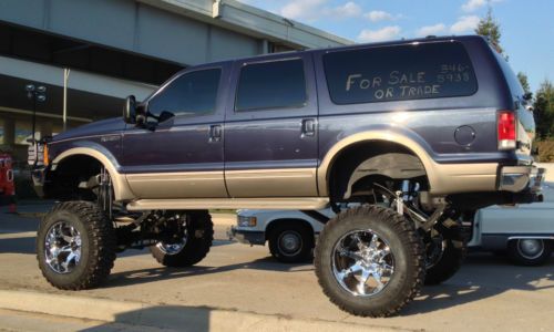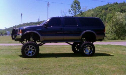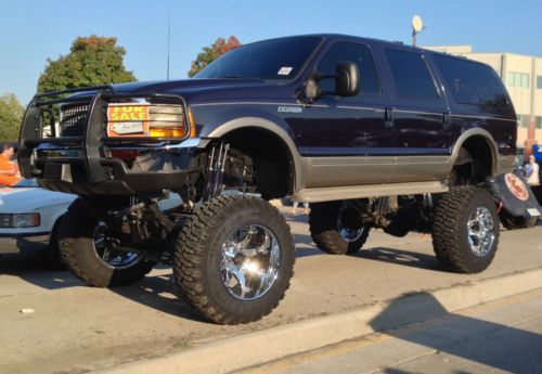 2000 Ford Excursion with 20” + lift, 4WD, Limited edition, automatic transmission, 10 cylinder gasoline, SUV, loaded with options, air conditioning, power windows, power locks, heated 6 way power seats, cruise control, tilt wheel, anti-lock brakes, driver & passenger air bags, tan leather seats, third row seating, 6 disc in-dash CD player, blue exterior with tan bottom, 20” lift, Interco tires 40"x14.5R22LT tires, 10 ply tires, Fuel 22" chrome wheels, 4 way adjustable Rancho 9012 triple shocks on all 4 corners, cross over steering, new gears, custom exhaust, brush guard, Hughes built transmission and transfer case with the best billet aluminum towing converter, triple disc heavy duty brakes, Tow Master power mirrors, runs and drives great, too many options to list, must see to appreciate, definitely one of a kind.