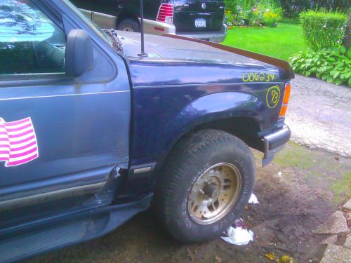 you will see from the pics all the damage is to the passanger side, part of the door but other wise the rest of the truck is in good condition. with some basic rust in the normal spots on these explorers like on the rear rocker panels there is rust. 1993 Gun Metal (blueish green) Ford Explorer. truck specs are: 4 door 4x4. Truck has many accessories and aftermarkets. lether interior cd changer, and pioneer cd stereo deck. Rain guards. Moon roof / sunroof, automatic, power seat and windows and side mirrors. only thing that need to be fixed is a part for the shifter needs to be replaced and alarm system to be disabled |