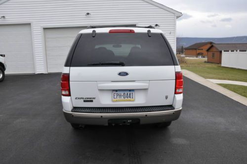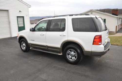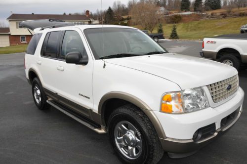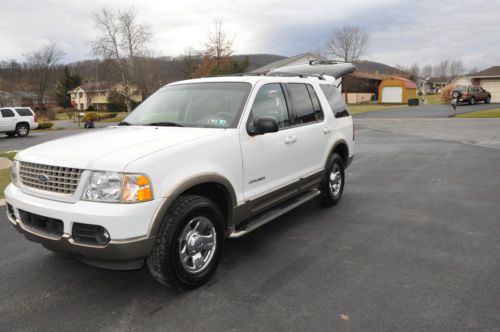 2002 Ford exploreer eddie bauer edition 4x4 4WD. In very good condition. 4 doors. oxford white/medium beige accent paint exterior. Medium parchment leather interior. 4.6 L V8 engine. 5 speed automatic O/D transmission. Running boards, power moon roof, tilt steering wheel, adjustable pedals with memory, homelink, pwer bucket front seats, front heated leather seats, 3rd row seat package, power windows, power door locks, power steering, cruise control, air condtioning, AM/FM stereo with 6 disc CD, rear wiper, trailer tow package with hitch. Small tear in drivers side seat. 116,500 miles. If you have any questions please email me. Payment must be received 5 days after auction is won through paypal or in-hand, unless other arrangements have been made. |