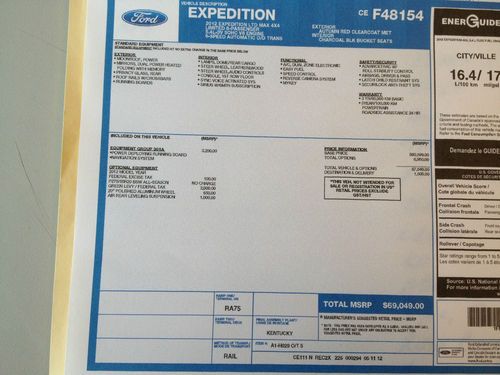 ONLY 7,500 MILES, MSRP NEW WAS $69,049.00-----THIS IS AN 8 PASSENGER MAX LENGTH EDITION----NON SMOKER---NON ACCIDENTS----ORIGINAL PAINT----CLEAN CAR FAX---THIS IS A GREAT PEOPLE MOVER OR A GREAT BOAT OR TRAILER PULLER----THIS EXPEDITION LIST NEW FOR OVER $69,000------GREAT VALUE FOR THE MONEY-----AS I STATED ABOVE WE ARE NEW TO E BAY MOTRORS AND HAVE NO FEEDBACK BUT WE ARE BY NO MEANS NEW TO THE BUSINESS----WE STRIVE FOR 100 % SATISFACTION IN OUR DAY TO DAY BUSINESS AND WILL DO THE SAME ON E BAY, SO PURCHASE WITH CONFIDENCE----ALL THE OPTIONS YOU COULD DESRIE EXCEPT FOR REAR DVD SYSTEM----THIS VEHICLE IS ADVERTISED LOCALLY AND WE HAVE THE RIGHT TO END THE E BAY AUCTION AT ANYTIME----WE CAN HELP YOU TO MAKE ARRANGEMENTS FOR SHIPPING IF NEEDED----IF NEEDED PLEASE CALL ROY AT 902-999-1160