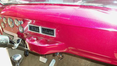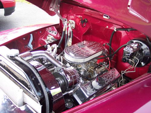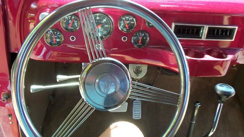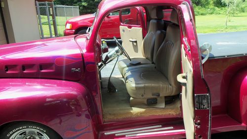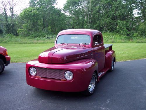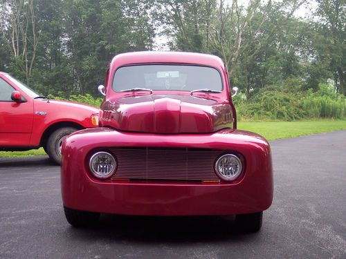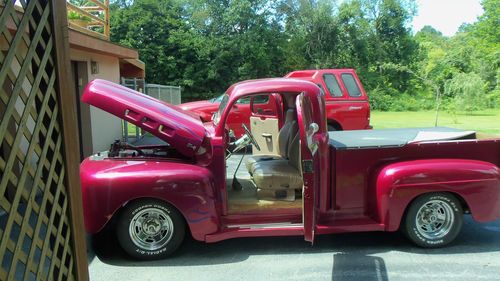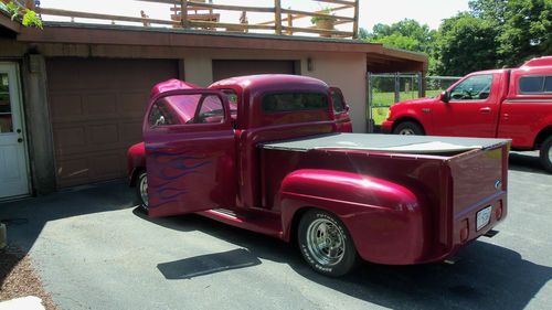 A real sharp 1948 Ford F-1 Pickup, custom paint - Cranberry w/Flames). sub framed with a 70 Model Nova front and rear, power steering, power brakes, emergency brake, A/C, Automatic Transmission, new wiring harness, cigarette light port, aluminum fuel tank, shaved door handles, 3" cut out roof, suicided doors, Tilt Steering , overhead console w/AM/FM/DVD player, new gauges, custom door panels, custom paint (Cranberry w/Flames), roll panel in rear, rear air shocks, tail lights frenched in, dual exhaust, Eldebrock intake with a 650 Eldebrock carb, aluminum radiator overflow, American racer rims, custom front grill and custom tailgate. wooded bed w/tonneau cover This truck is all steel.